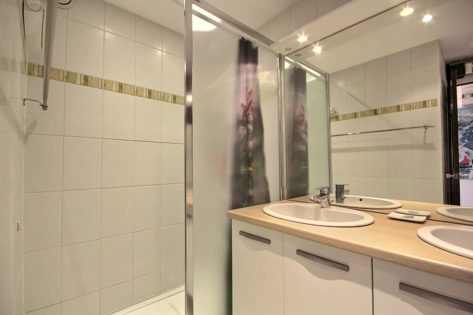 Salle de bains avec grande cabine de douche, double vasque, lave-linge