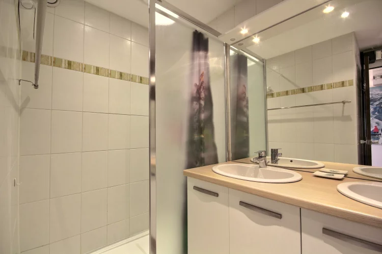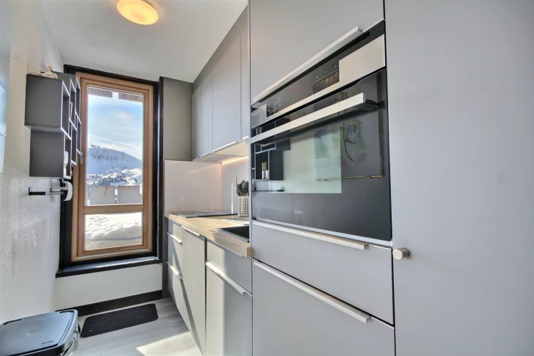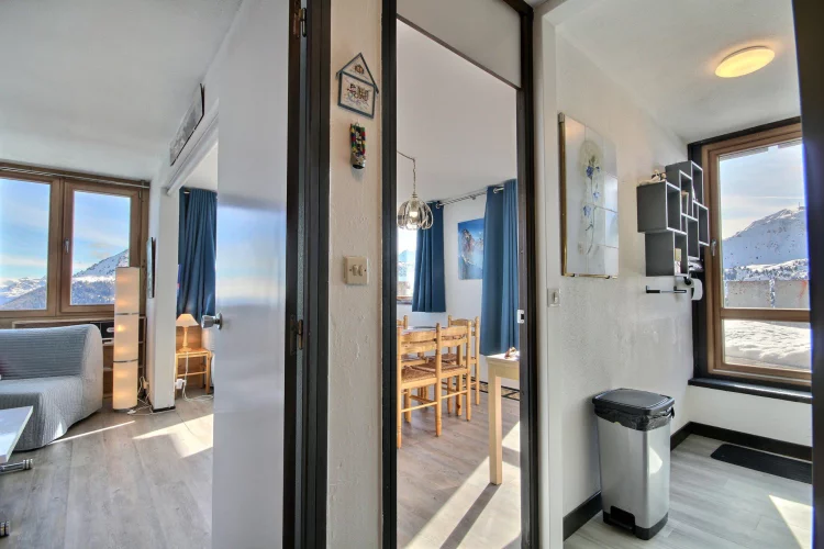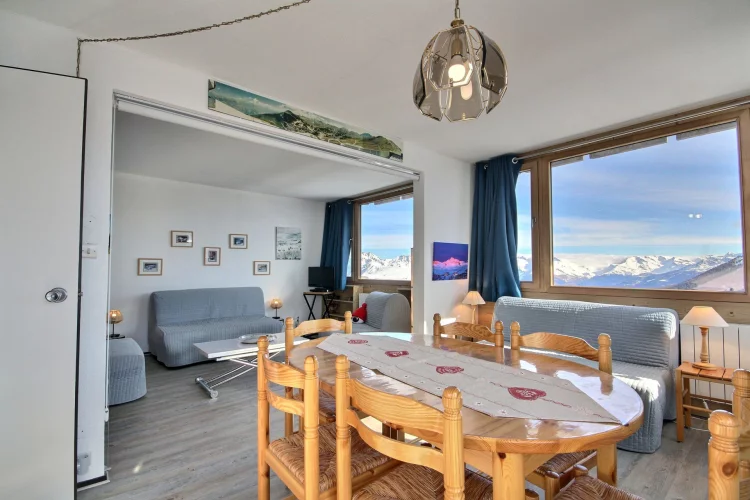 Très bel appartement équipé pour 6 personnes, offrant une vue magnifique sur les montagnes et le domaine skiable, très grande terrasse orientée au sud, niveau K (10ème étage par rapport à l'entrée de l'immeuble, 4ème par rapport au front de neige)