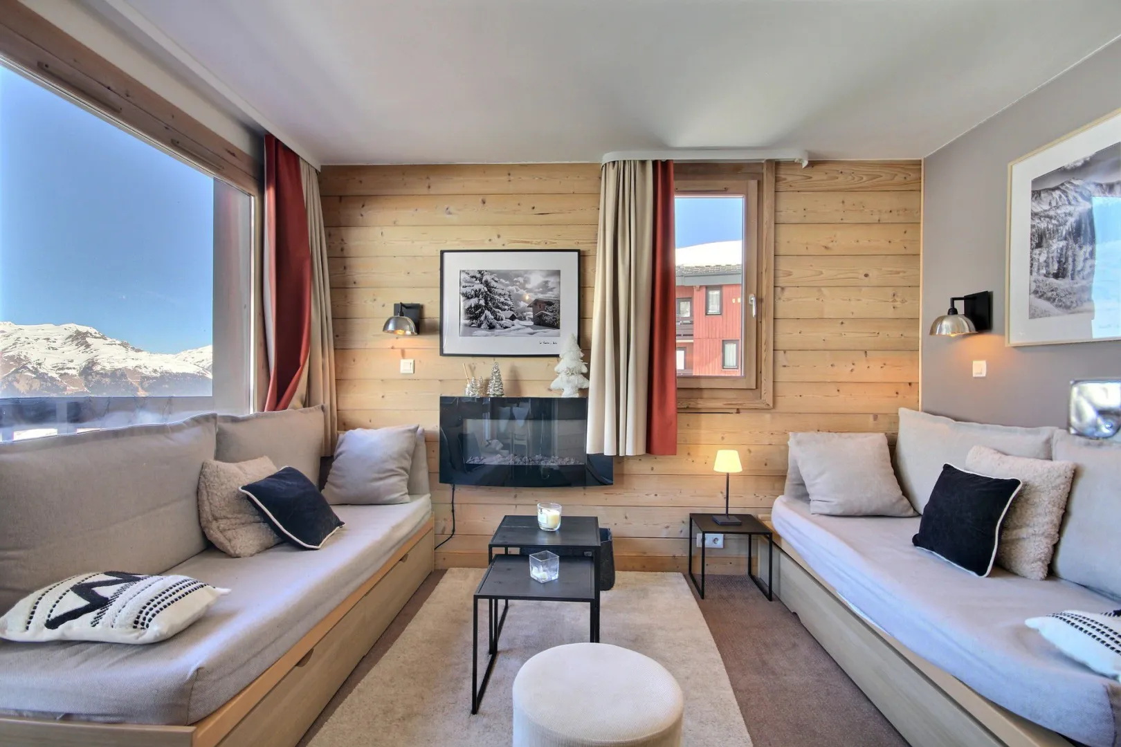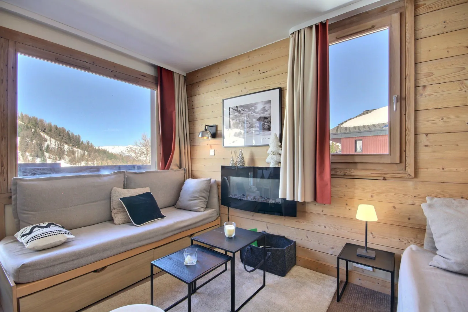 Séjour ouvrant sur le balcon : 2 banquette-lits d'1 personne, coin repas pouvant accueillir 4 convives, cheminée électrique, télévision