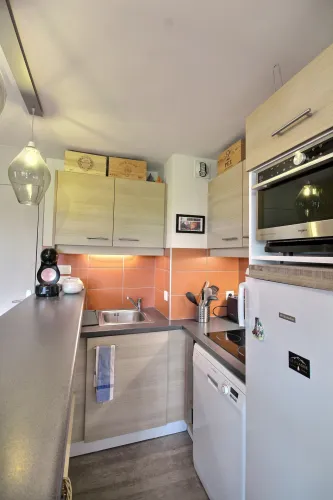 Coin cuisine ouvert sur le séjour : plaques vitrocéramiques, four micro-ondes/grill, régrigérateur, lave-vaisselle