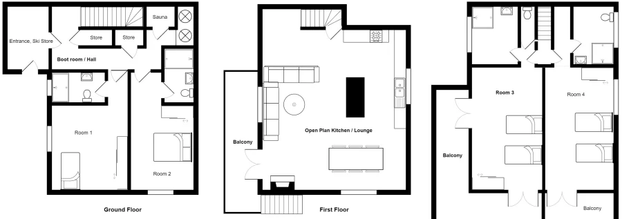 Le deuxième chalet, d'une superficie de 120.45m², dispose de 4 suites (avec salle d'eau et toilettes privées) et a la capacité d'héberger 8 personnes.