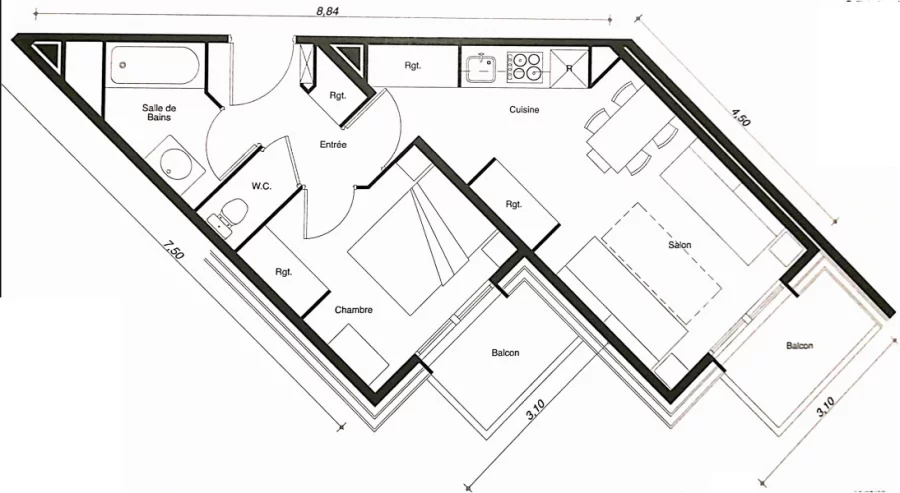 - pièce à vivre avec coin repas ouvrant sur un balcon orienté nord-ouest